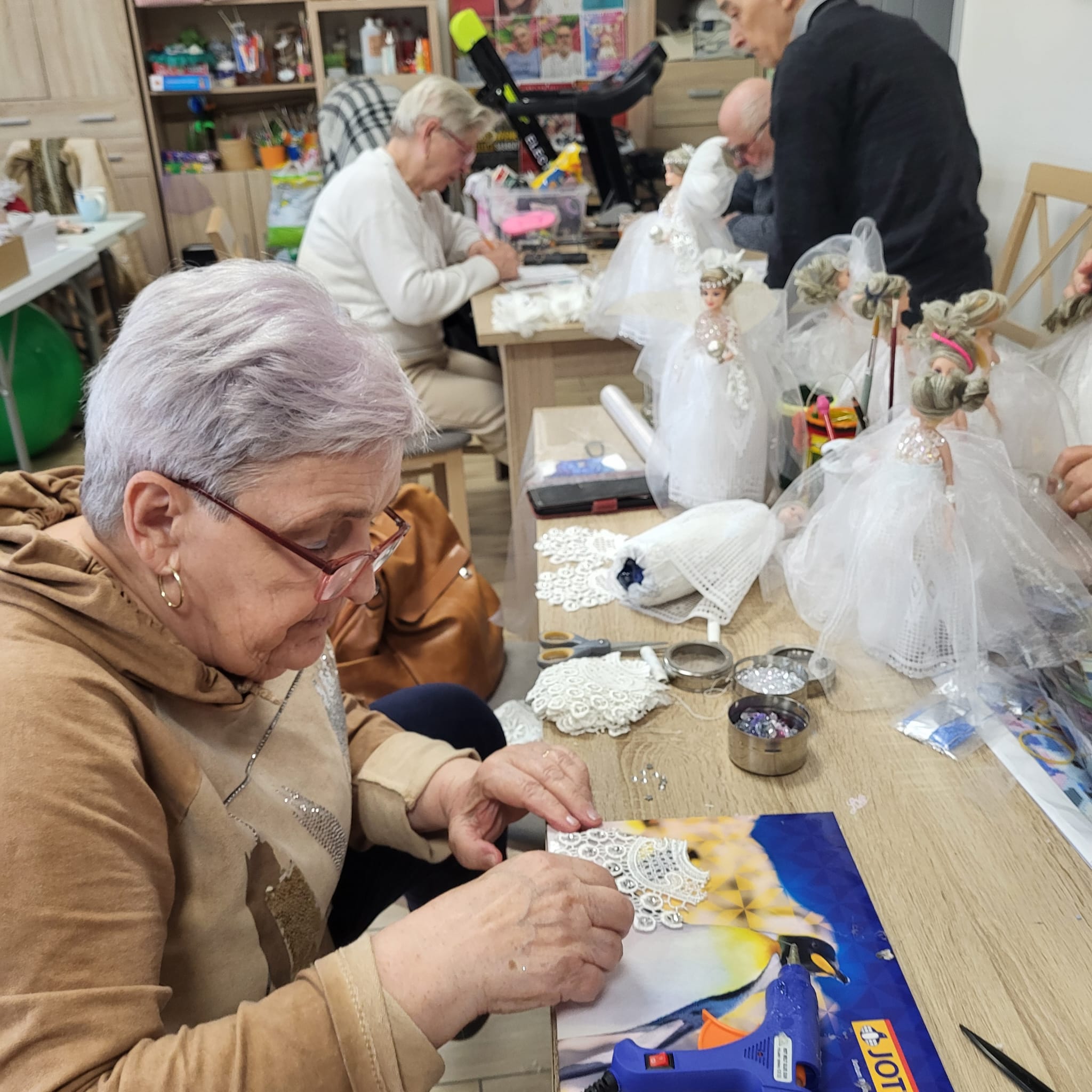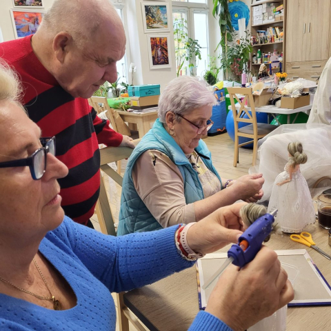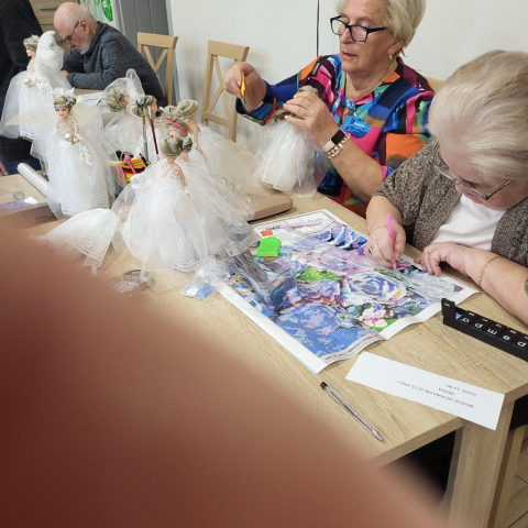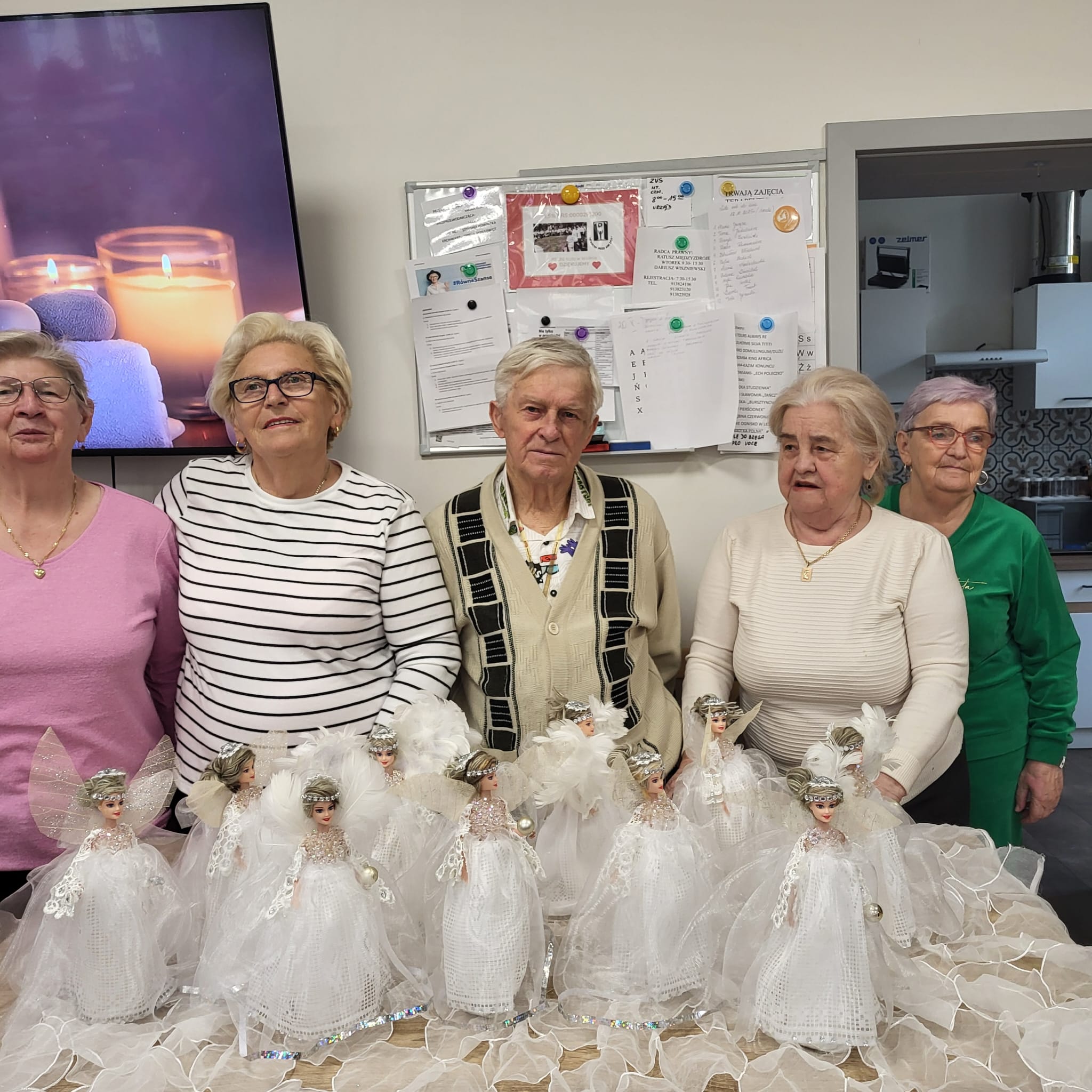 Uczestnicy Klubu z precyzją i dokładnością, w ogromnym skupieniu tworzyli piękne Anioły. Włożyli w tę pracę dużo serca, pomysłowości i cierpliwości. Najważniejsza jest chęć tworzenia i współpraca w grupie. Przy okazji Seniorzy podtrzymują sprawność dłoni, rozwijają kreatywność, redukują stres. Przy muzyce relaksacyjnej mają przyjemność skupienia się na pracy i odprężyć się.