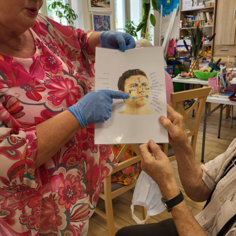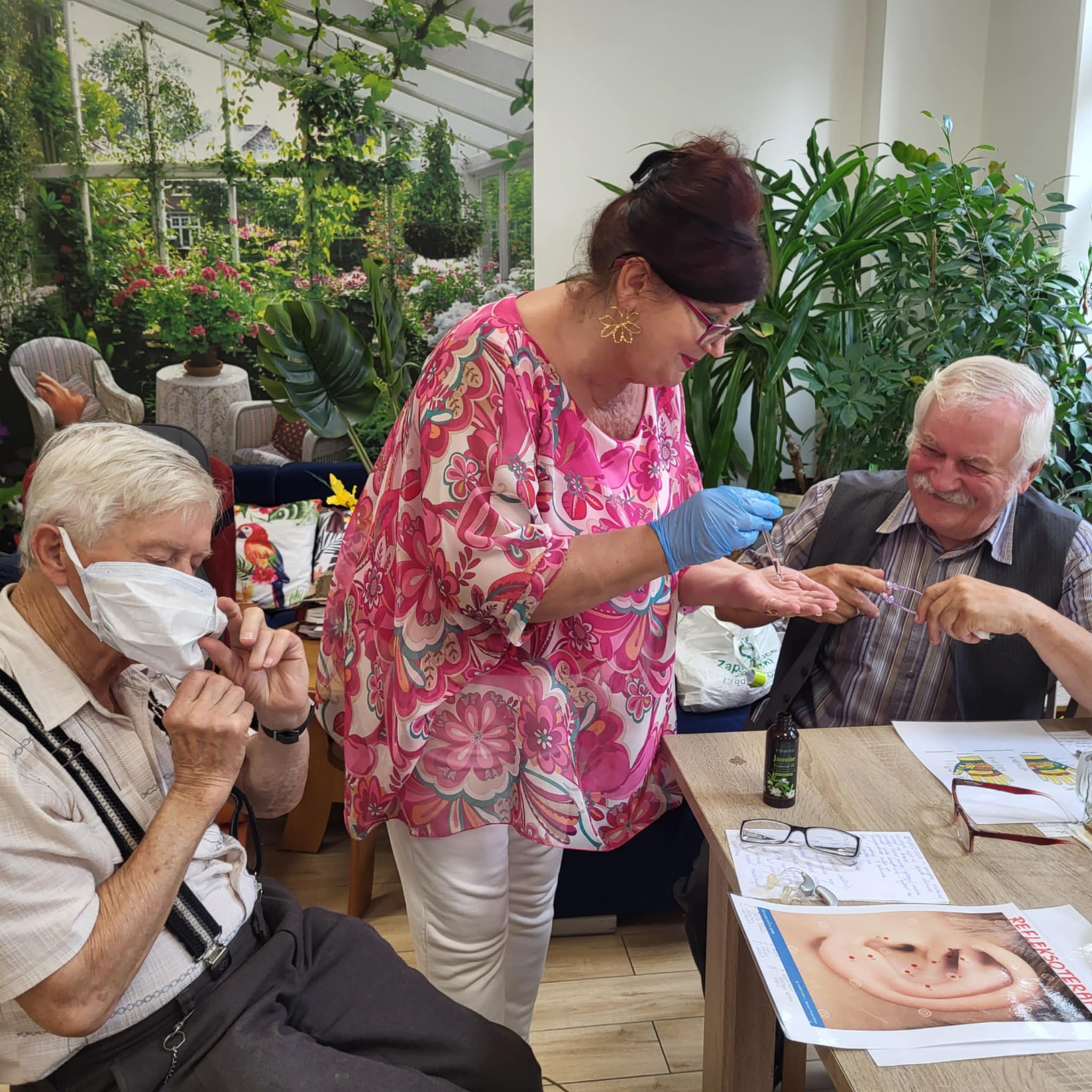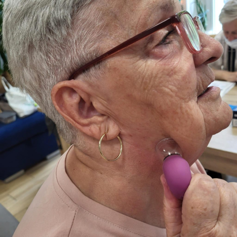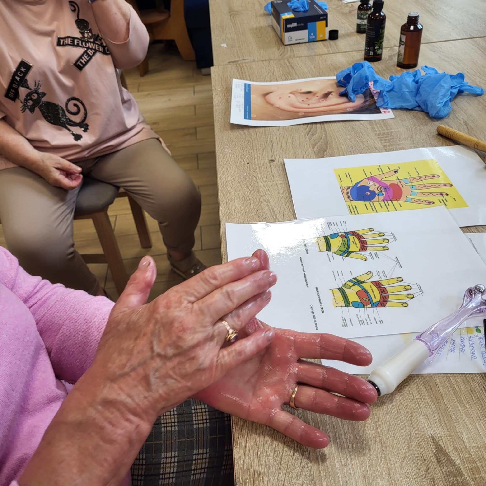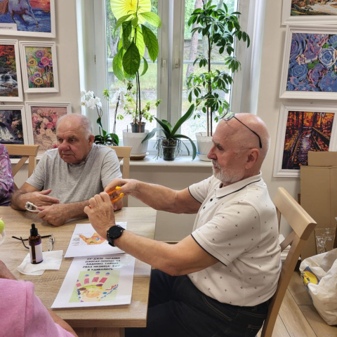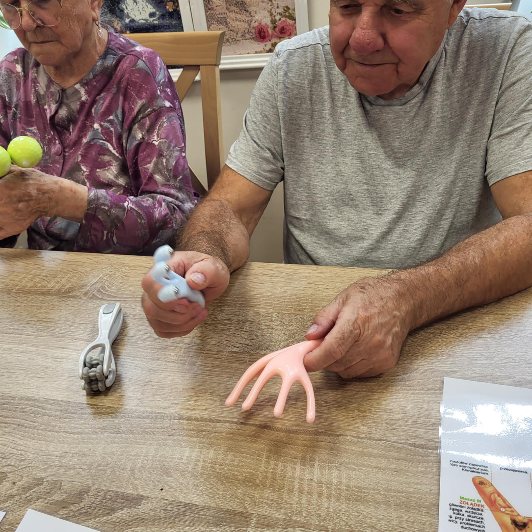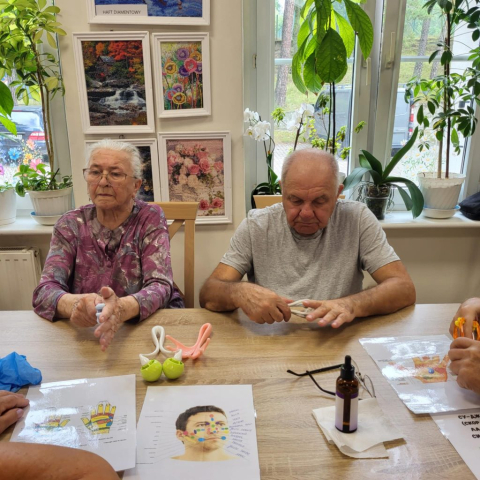 Wykorzystujemy olejki do masażu np. olejek lawendowy , który działa również przeciwbakteryjnie i przeciwgrzybiczo, jaśminowy o działaniu regeneracyjnym i konwaliowy przeciwdziałający obrzękom. Największym zainteresowaniem Seniorów były urządzenia do masażu palców, przynoszący niebywałą ulgę.