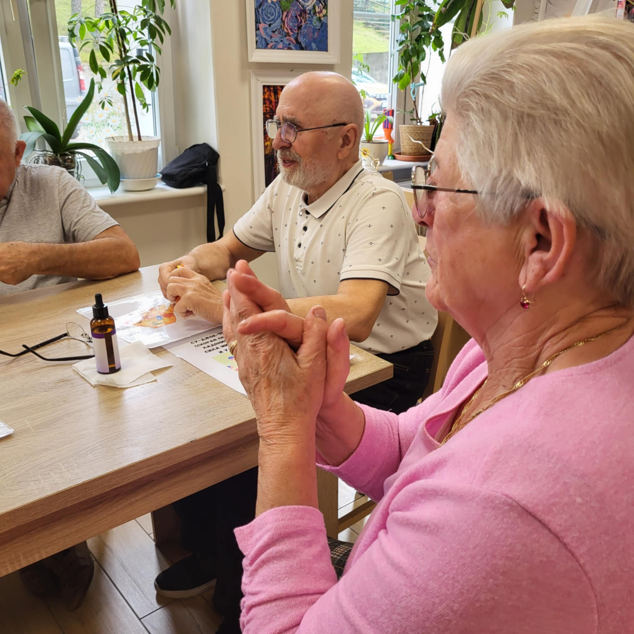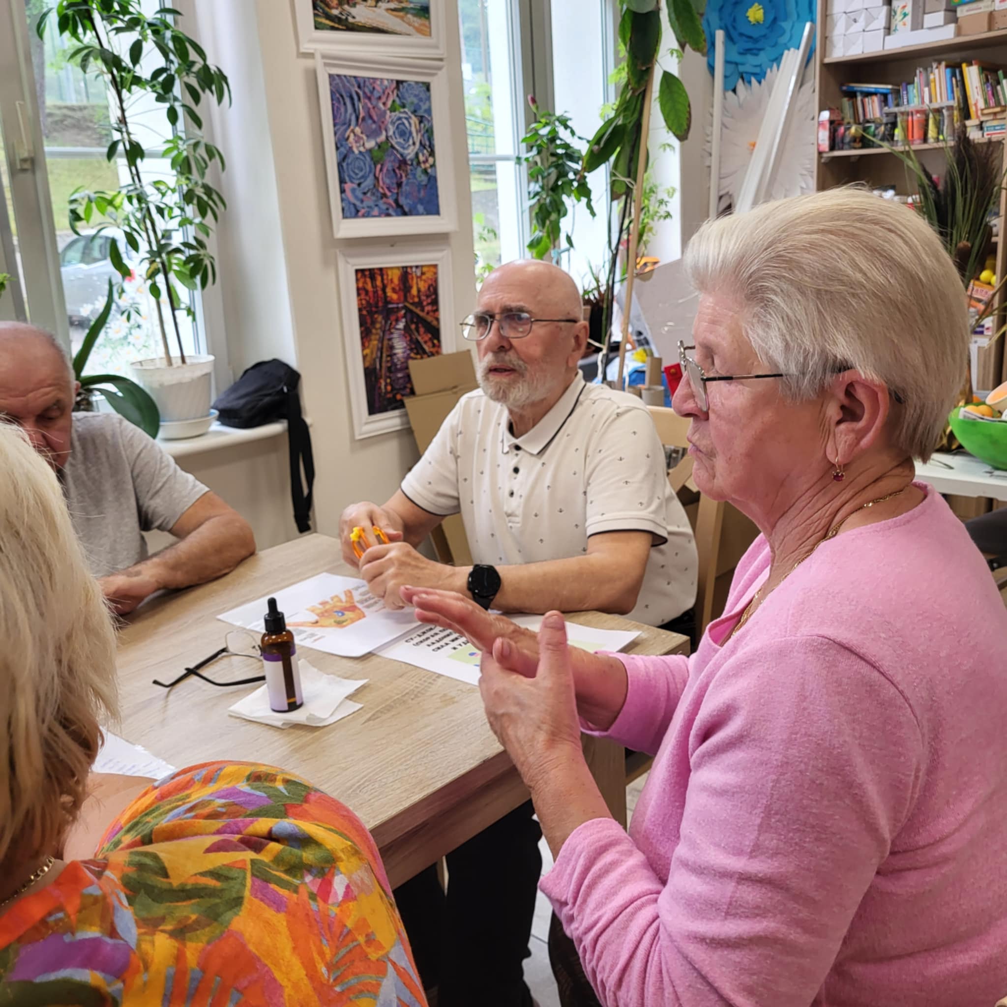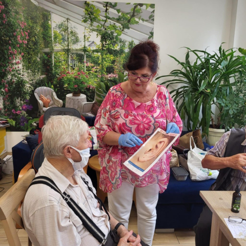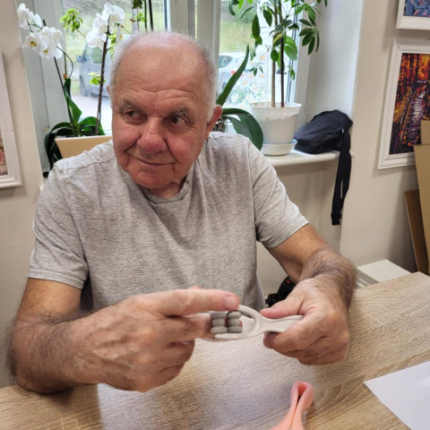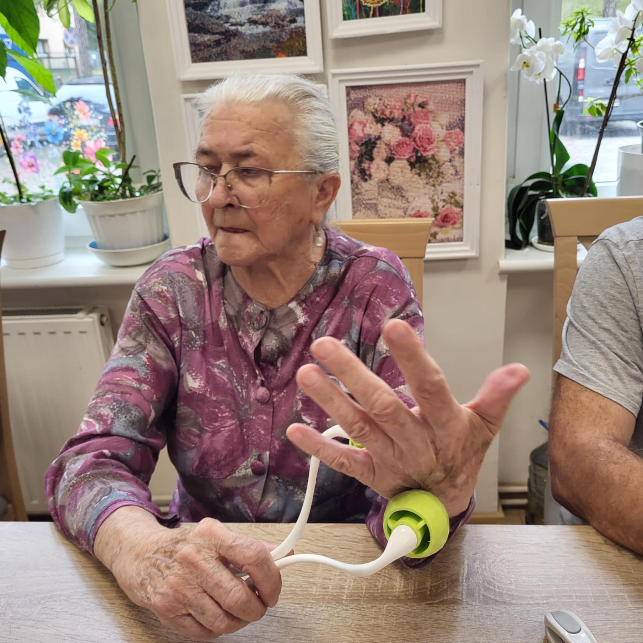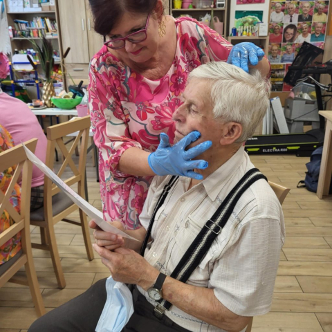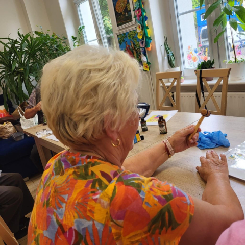 Wykorzystujemy olejki do masażu np. olejek lawendowy , który działa również przeciwbakteryjnie i przeciwgrzybiczo, jaśminowy o działaniu regeneracyjnym i konwaliowy przeciwdziałający obrzękom. Największym zainteresowaniem Seniorów były urządzenia do masażu palców, przynoszący niebywałą ulgę.