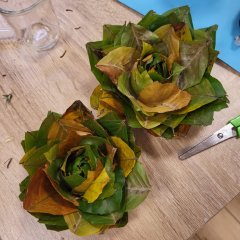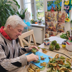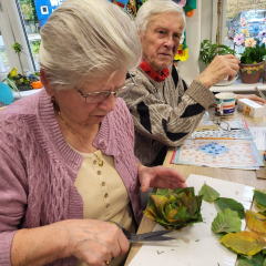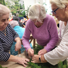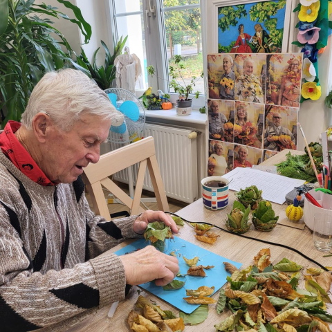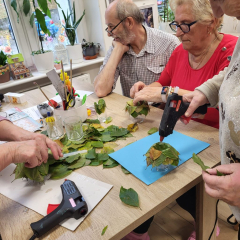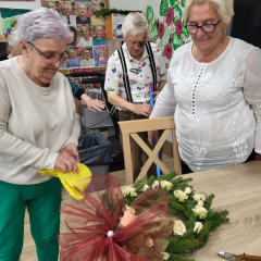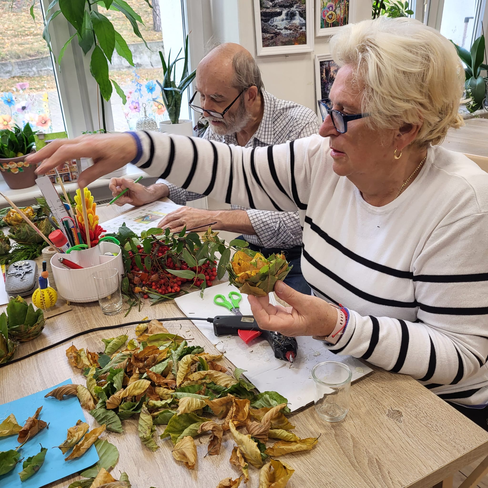 Seniorzy dobierają materiały i realizują indywidualne pomysły. Z kolorowych liści stworzyli wspaniałe róże do stroików jesiennych, łącząc z jarzębiną, dziką różą czy bluszczem .Uczestnicy Klubu ze świerku i sztucznych kwiatów wykonali kompozycje nagrobne.
