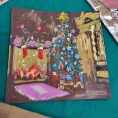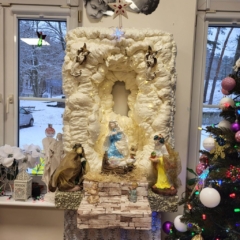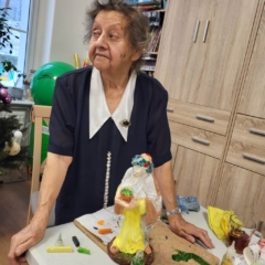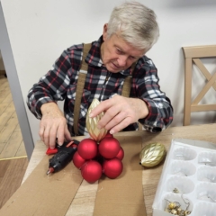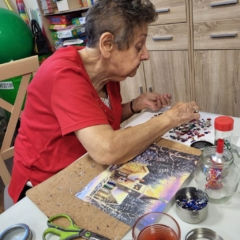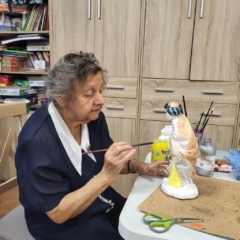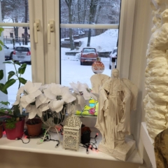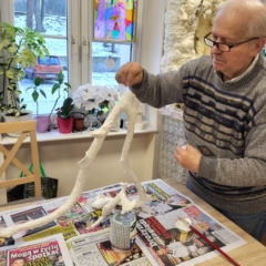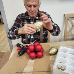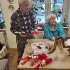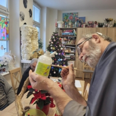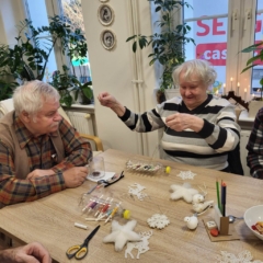 Seniorzy z ogromną dokładnością i sercem „skonstruowali” szopkę betlejemską z pianki izolacyjnej. Ozdabiali styropianowe figurki, na oknach powstały kolorowe witraże. Z żarówek wyczarowali bałwanki w czapkach i szalikach. W ramach sztuki użytkowej powstały kartki świąteczne malowane farbami akrylowymi i olejnymi. Z rolek po papierze seniorzy wykleili świąteczne żołnierzyki niczym dziadki do orzechów.